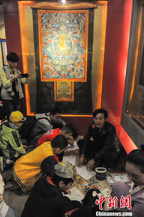 在老师带领下,在文化馆中学习绘制唐卡的小朋友。中新网记者 富宇 摄