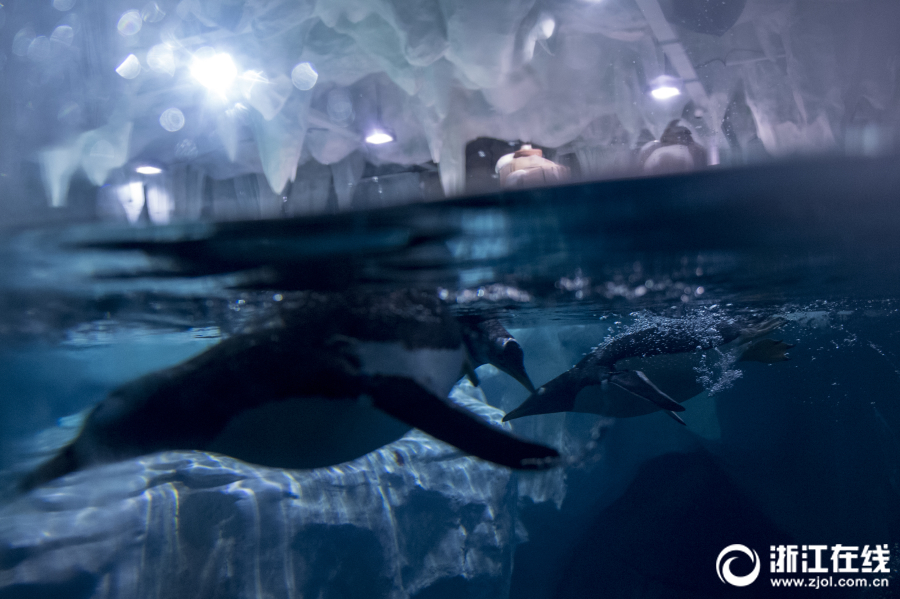 在杭州长乔极地海洋公园工作的郭天强是名副其实的“企鹅奶爸”。他上班第一件事,是换上棉衣棉裤挨个检查企鹅宝宝的身体状况。饲养企鹅的环境气温必须控制在0摄氏度左右,除了为“孩子们”做清洁和喂食,郭天强还要换上潜水服清理企鹅的游泳场。郭天强说:“水里特别冷,下水前都要做运动。”可见孩子们再萌,好生伺候也不容易。“我看到小企鹅慢慢长大,开始谈恋爱。”他说,“它们会相互鞠躬来表达爱意,每次看到这些我就特幸福。”(浙江在线记者 冯贺 尹海木 摄)