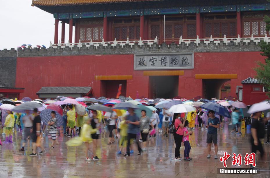 7月24日,受台风“安比”外围云系影响,北京再次迎来强降雨。北京于23日下午接连发布了暴雨蓝色预警、大风蓝色预警和地质灾害气象风险黄色预警。图为游客撑伞游览故宫博物院。中新社记者 贾天勇 摄
