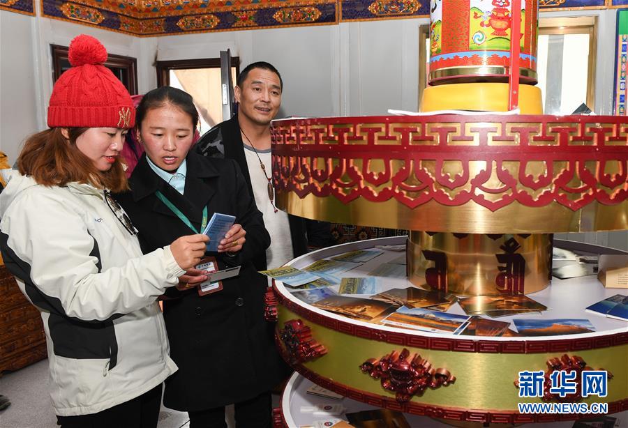 7月24日,天上西藏邮局营业员措姆(中)为游客介绍特色明信片。