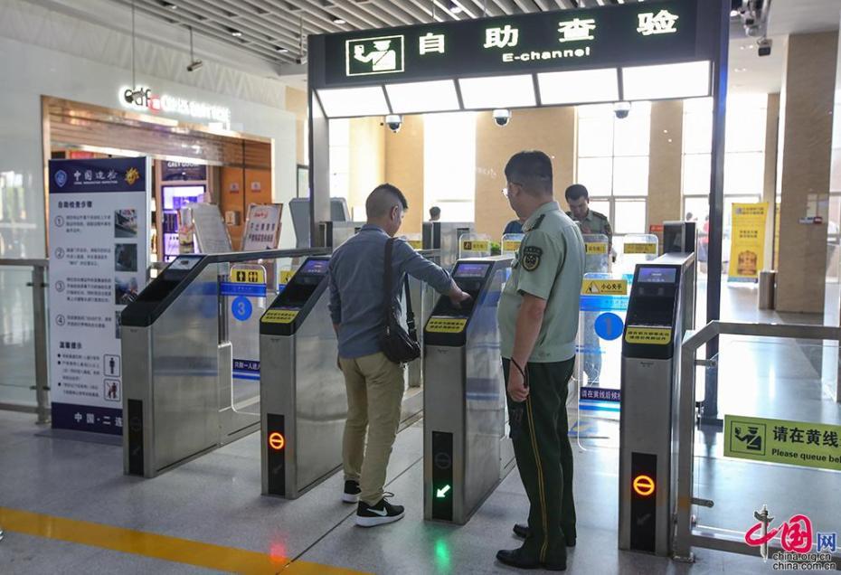 旅客通过边检自助查验通道通关。驻守在二连浩特口岸的二连边防检查站,是一支现役公安边防部队,1956年伴随北京——乌兰巴托——莫斯科国际联运列车的正式开通而成立,主要担负着二连口岸铁路客货运、公路客货运和国际机场3种通关形式5个执勤现场的出入境边防检查任务和3.2平方公里边境线、2.58平方公里口岸限定区域的监护管理任务。中国网记者 伦晓璇 摄 图片来源:中国网