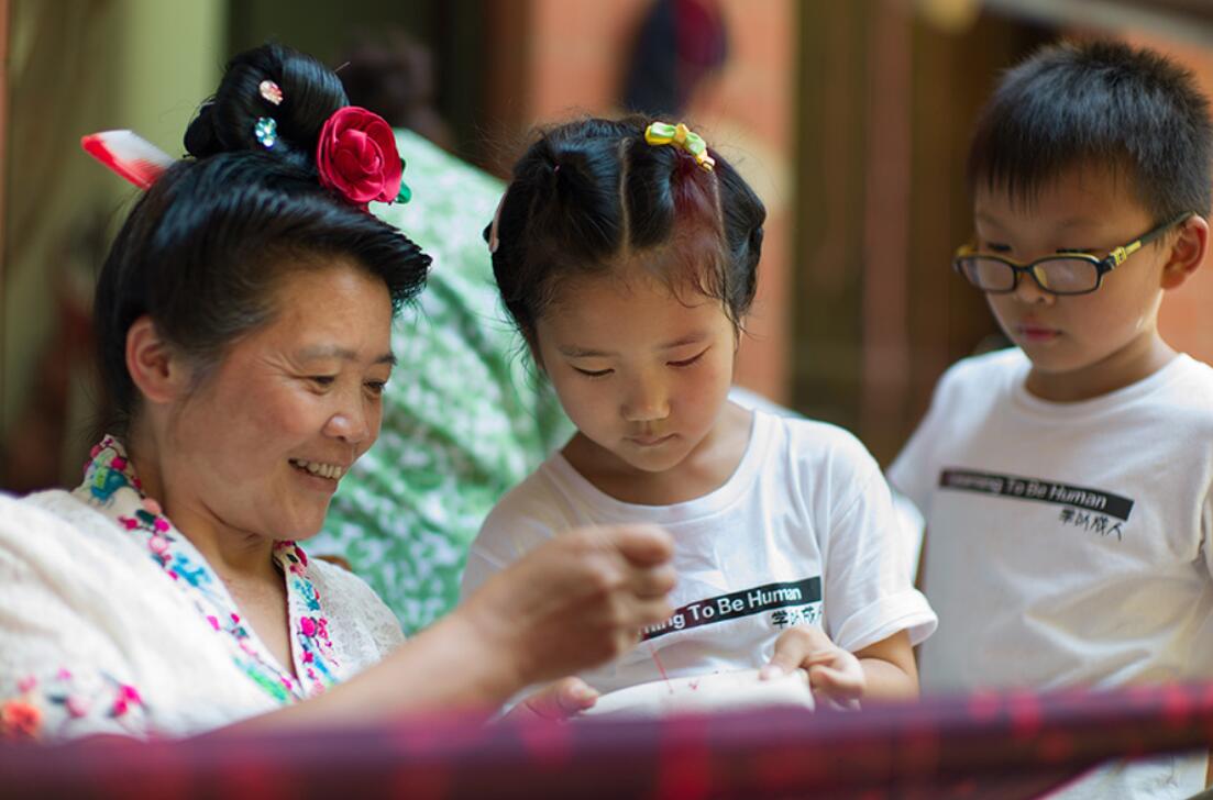 夏令营团队的小朋友跟贵州省丹寨县的苗族绣娘学习苗绣。苗绣于2006年被列入第一批国家级非物质文化遗产名录。(摄影/林斌)