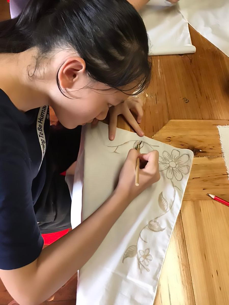 夏令营团队的小朋友观摩苗族蜡染工艺后尝试绘制蜡染图案。2006年,苗族蜡染技艺列入第一批国家级非物质文化遗产名录。(摄影/林斌)