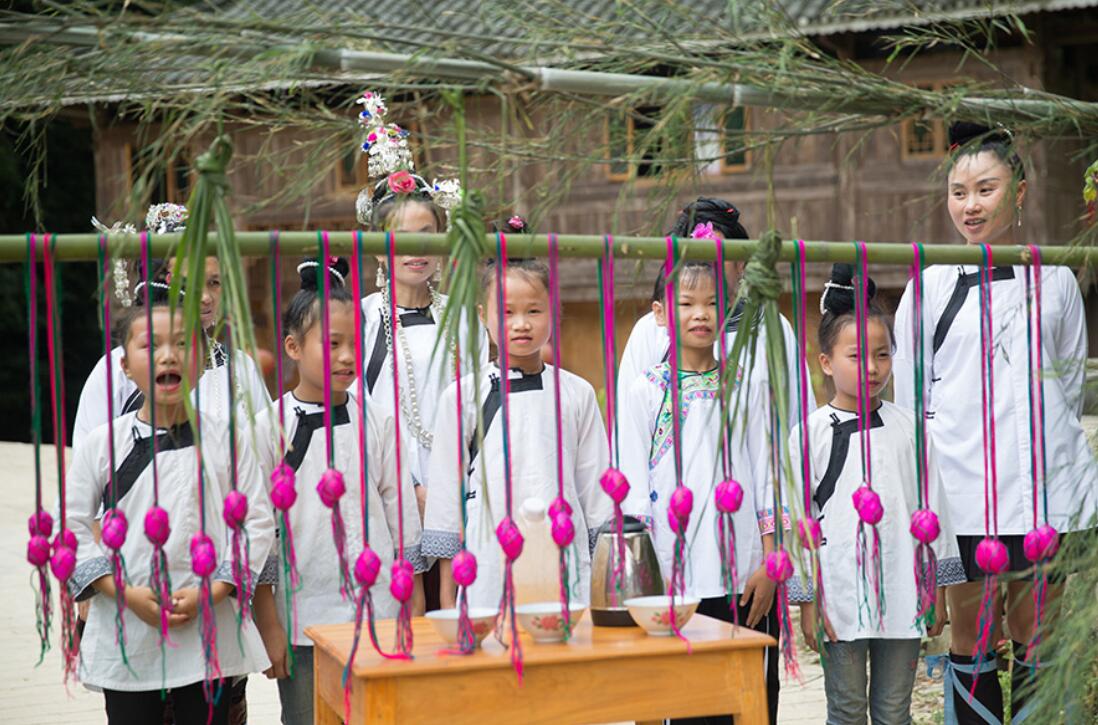 贵州省榕江县归柳村的侗族小朋友扎起彩蛋、唱起侗歌迎接远道而来的客人。2009年贵州的侗族大歌被联合国教科文组织列为“人类非物质遗产代表作名录”。(摄影/林斌)