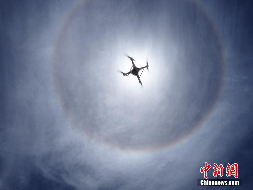 7月25日午间,在青海省海西蒙古族藏族自治州境内的翡翠湖上空,出现日晕景。太阳周边浮现出彩色光圈,均匀环绕,光彩照人。柴达木盆地地处青海省海西州,面积约26.5万平方公里,盆地南缘是长江发源地,盆地内有大小河流100多条,湖泊90多个。刘占昆 摄