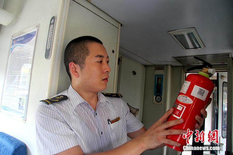 夜幕降临,无人的车厢内,袁光洪握着手电再次开始了巡视。他说,真正放松下来需要等到次日早上列车出库后。图为中午14时,列车内最高温度达到43℃,袁光洪正在排查车厢安全隐患,检查列车隐蔽部位是否有异常(在高温下引起自燃)。 陶静 摄