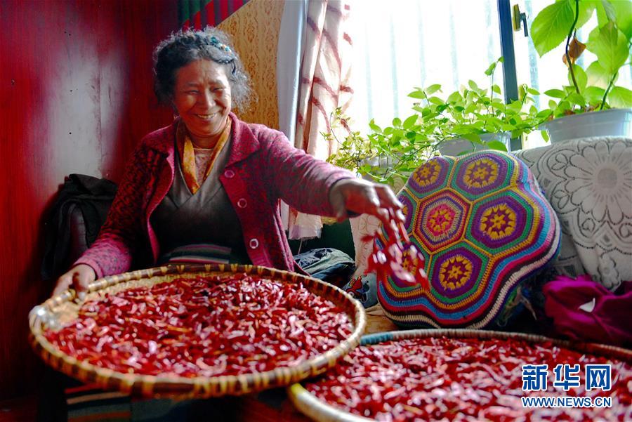 在吉隆县吉隆镇玛嘎村,村民拉巴在新居客厅沙发上挑选晾晒好的红辣椒(7月26日摄)。 新华社记者张汝锋摄
