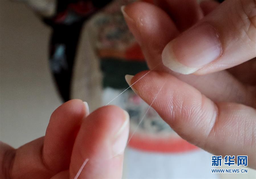 绣工正在把一根丝线劈成六十四分之一(7月25日摄)。 新华社记者杨磊 摄