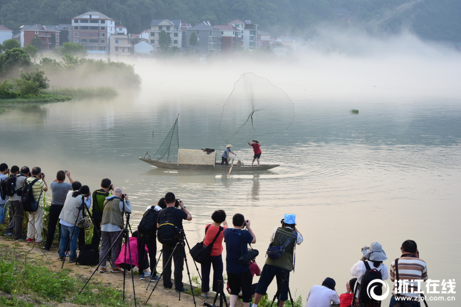 浙江在线7月29日讯(浙江在线拍友 宁文武 摄)7月29日清晨,在建德市下涯生态湿地,一批江苏、福建、安徽等地的摄影爱好者架着长枪短炮在拍摄江雾中渔家生活的场景。每逢盛夏时节,新安江畔形成如梦似幻的江雾奇观,与下涯湿地形成一道独特的生态自然景观,每年吸引国内外数以万计的游客和摄影爱好者前来旅游观光,采风拍摄,避暑度假。