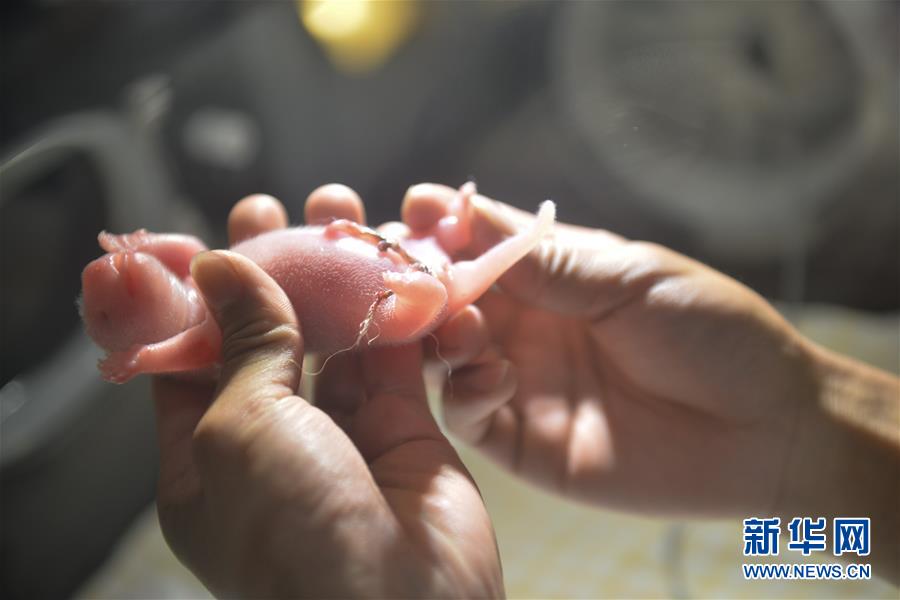 这是在中国大熊猫保护研究中心卧龙核桃坪野化培训基地拍摄的刚出生的雌性大熊猫宝宝(7月25日摄)。 新华社发(李传有摄)