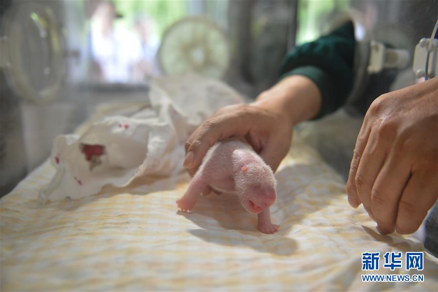 这是在中国大熊猫保护研究中心卧龙核桃坪野化培训基地拍摄的刚出生的雄性大熊猫宝宝(7月25日摄)。 新华社发(李传有摄)