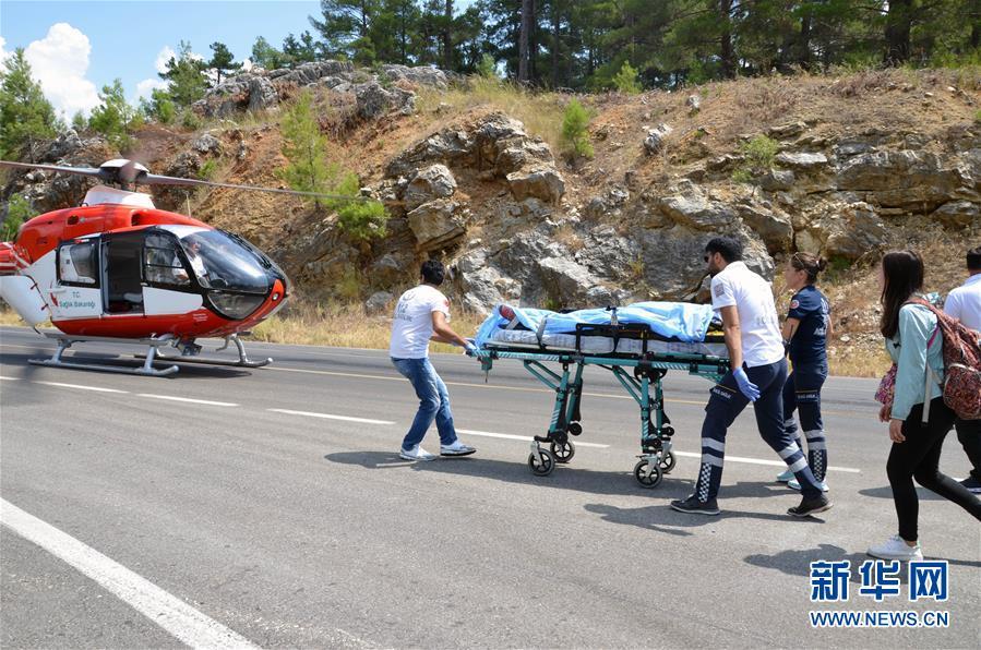 7月29日,在土耳其南部安塔利亚省阿克塞基镇的车祸事故现场,救援人员准备用直升机运送伤员。 据中国驻土耳其大使馆和驻伊兹密尔总领馆消息,当地时间29日10时左右,一辆载有中国游客的大巴在土耳其南部安塔利亚省发生车祸,造成车上包括31名中国游客在内的33人不同程度受伤。据了解,该旅游大巴当时从安塔利亚省省会安塔利亚市区前往土中部旅游景点卡帕多奇亚,在该省阿克塞基镇与迎面驶来的两辆车相撞并侧翻。 新华社发