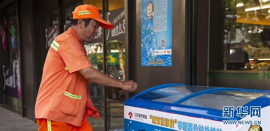 7月30日,一名环卫工在南京街头“爱心冰柜”前取用冷饮。 新华社发(苏阳 摄)