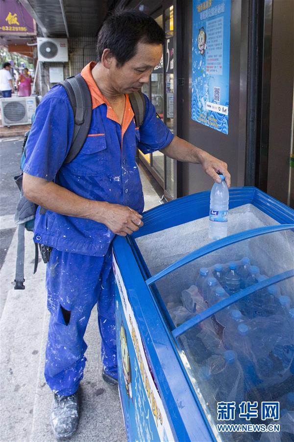 7月30日,一名户外劳动者在南京街头“爱心冰柜”前取用冷饮。 新华社发(苏阳 摄)