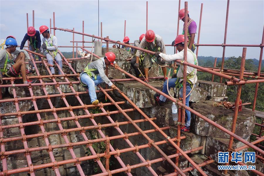这张2017年9月14日在柬埔寨暹粒拍摄的照片显示,工人在茶胶寺保护修复项目现场工作。