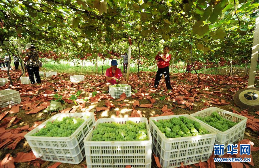 7月30日,果农在贵州省玉屏侗族自治县新店生态葡萄现代农业园区采摘水晶葡萄。 新华社发(杨文斌摄)