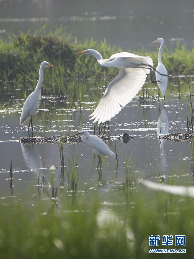 7月30日,白鹭在江苏省盱眙县一处湿地栖息。 新华社发(颜怀峰 摄)