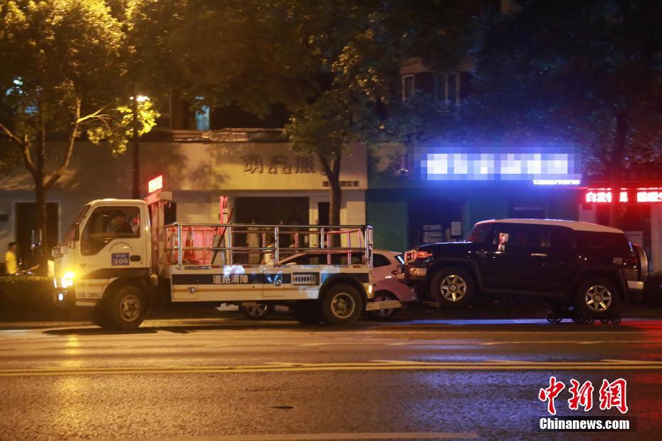 图为一辆事故现场的轿车被拖走。刘佩琦