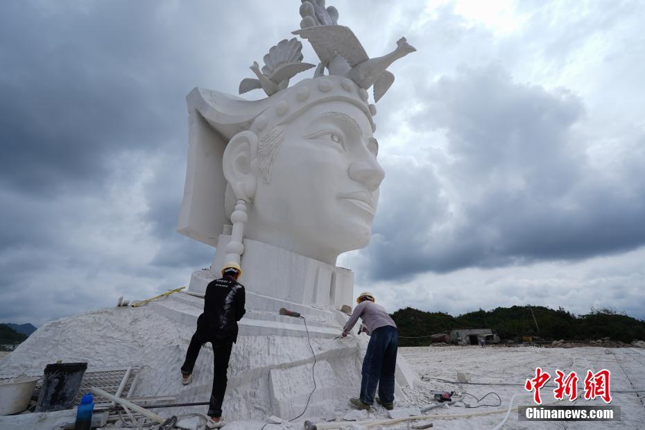 7月31日,两名工人对奢香夫人头像进行雕刻。奢香夫人的形象是根据贵州宣慰府描绘的奢香夫人通用形象塑造,整座雕塑高49米,工期为三年。头像石雕位于贵州省大方县百纳乡新华村,由大理石雕刻而成,目前已基本完成高达12米的头部雕刻。 中新社记者 贺俊怡 摄