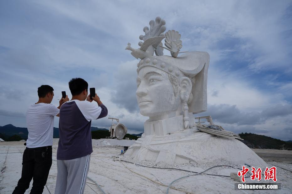 7月31日,两名游客用手机拍摄奢香夫人头像石雕。奢香夫人的形象是根据贵州宣慰府描绘的奢香夫人通用形象塑造,整座雕塑高49米,工期为三年。头像石雕位于贵州省大方县百纳乡新华村,由大理石雕刻而成,目前已基本完成高达12米的头部雕刻。 中新社记者 贺俊怡 摄