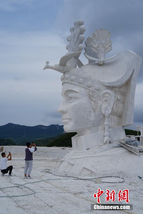 7月31日,两名游客用手机拍摄奢香夫人头像石雕。奢香夫人的形象是根据贵州宣慰府描绘的奢香夫人通用形象塑造,整座雕塑高49米,工期为三年。头像石雕位于贵州省大方县百纳乡新华村,由大理石雕刻而成,目前已基本完成高达12米的头部雕刻。 中新社记者 贺俊怡 摄