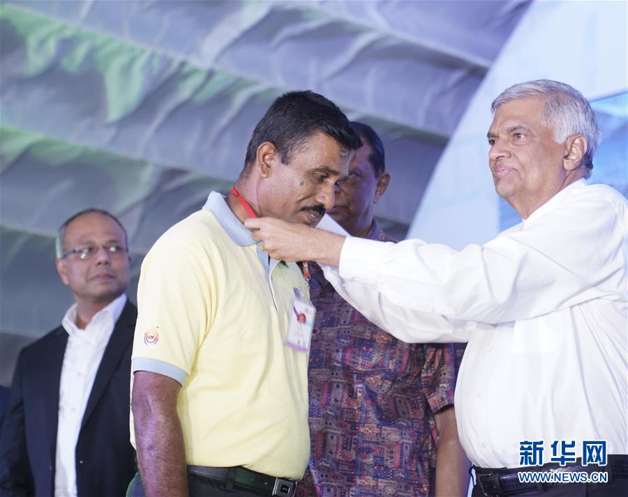 7月30日,在斯里兰卡科伦坡,斯里兰卡总理维克勒马辛哈(右)向一名“突突车”司机颁发导游证和培训结业证。 新华社记者唐璐摄