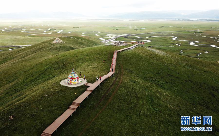 游客在玛曲县阿万仓湿地的观景步道上游览(7月31日无人机拍摄)。新华社记者 陈斌 摄
