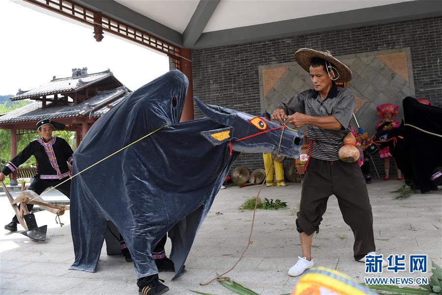 在广西南宁市青秀区南阳镇施厚村古岳坡,村民在表演斗春牛(7月19日摄)。 新华社记者 陆波岸 摄