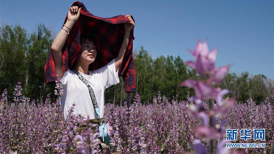 8月1日,游客在新疆昭苏县一处香紫苏花海景区游玩。