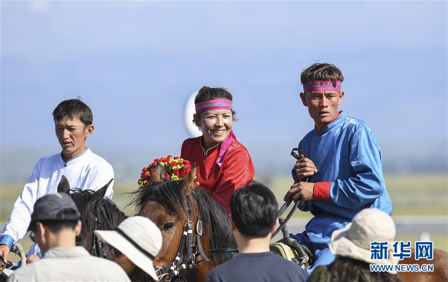 8月1日,在新疆昭苏县天马旅游文化产业园,肯巴提·买达力(中)和游客在互动。今年5月,她参加了马术表演队,每月收入2000元左右。新华社记者胡虎虎摄