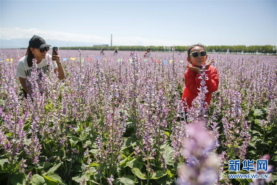 8月1日,在新疆昭苏县一处香紫苏花海景区,一对来自北京的母女在拍照留影。新华社记者黄臻摄