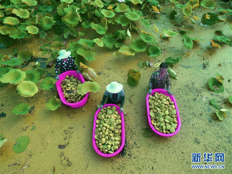 盛夏时节,山东省临沂市郯城县马头镇采莲湖的“复耕莲蓬”丰收上市,吸引临近客商前来采购。采莲湖所在地曾为砖厂,经开垦复耕后用于莲蓬种植和鱼类养殖。 新华社发(房德华 摄)