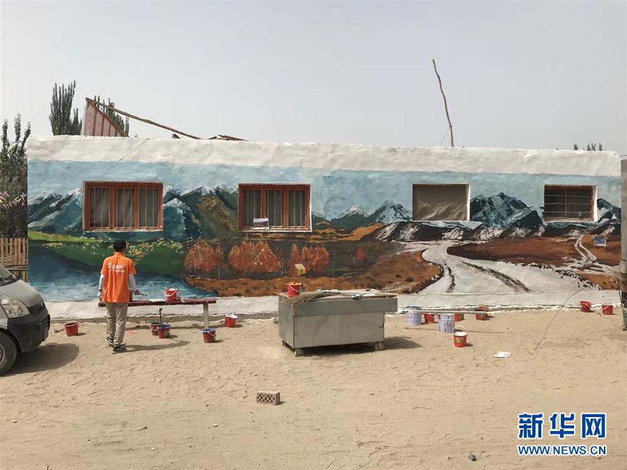 在新疆和田地区墨玉县巴夏克其村,青岛大学美术学院学生在墙上绘制《天山四季图》(7月21日摄)。 新华社发(支教团队提供)