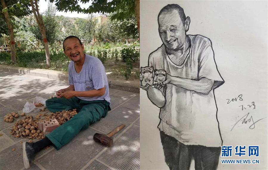 拼版照片:左图为在新疆和田地区墨玉县英吾斯塘村,老人如则麦麦提听闻支教学生将返回,特意剥了核桃,要学生们带着上路(7月31日摄);右图为青岛大学美术学院学生周文宇绘制的如则麦麦提的肖像速写(7月23日摄)。新华社发(支教团队提供)