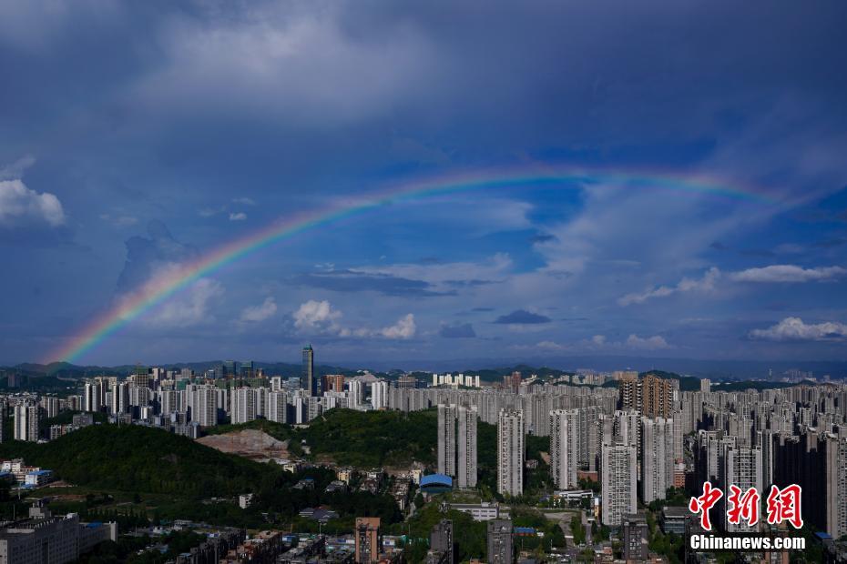 8月1日,一场太阳雨后,贵阳市上空出现彩虹景观,美不胜收。中新社记者 贺俊怡 摄