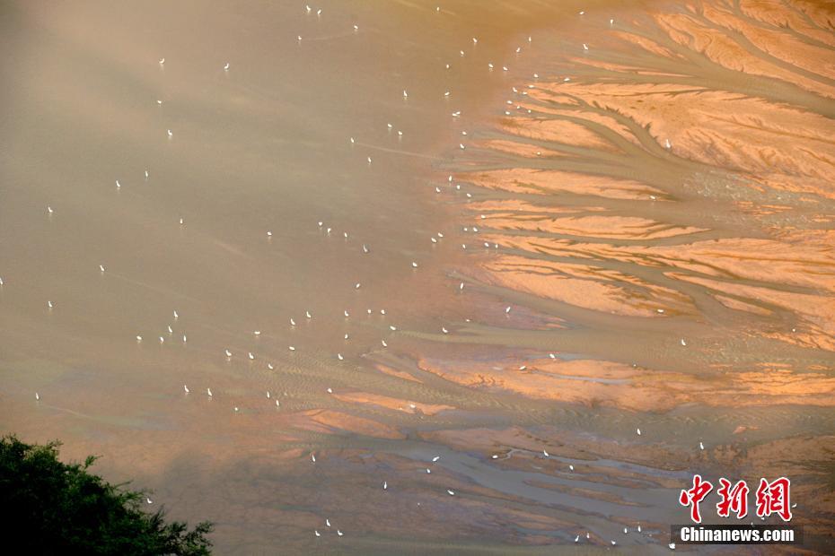 8月1日,河南济源小浪底水库黄河三峡段,由于小浪底水库调水调沙,位于小浪底水库大坝上游20公里处的黄河三峡水位降低,露出了部分河底,底部纹路明暗相间,酷似树影交错,成群的水鸟在“枝头”翔集,美似一副天然油画。 王中举 摄