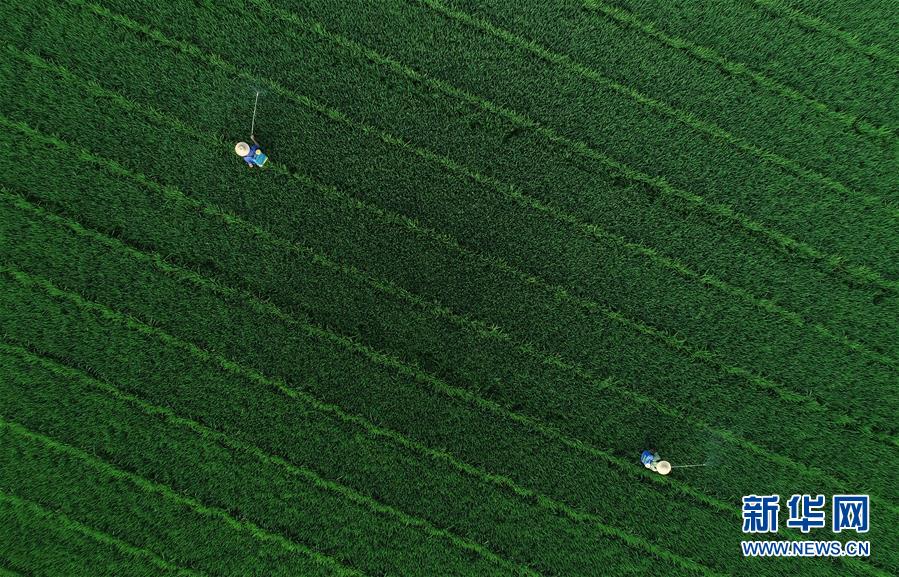 8月2日,安徽省肥西县丰乐镇三里村农民在水稻田间喷洒农药(无人机拍摄)。盛夏时节,安徽省肥西县丰乐镇农民抢抓农时,冒着高温收获莲藕、为水稻喷洒农药,田间地头一片繁忙景象。 新华社发(徐勇摄)