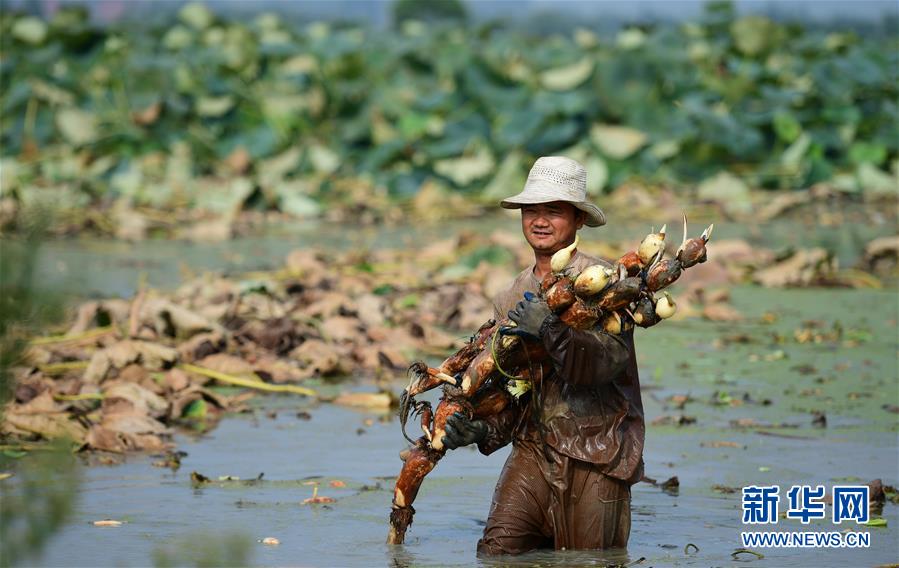 8月2日,农民在安徽省肥西县丰乐镇莲藕种植示范基地搬运莲藕。盛夏时节,安徽省肥西县丰乐镇农民抢抓农时,冒着高温收获莲藕、为水稻喷洒农药,田间地头一片繁忙景象。 新华社发(徐勇摄)