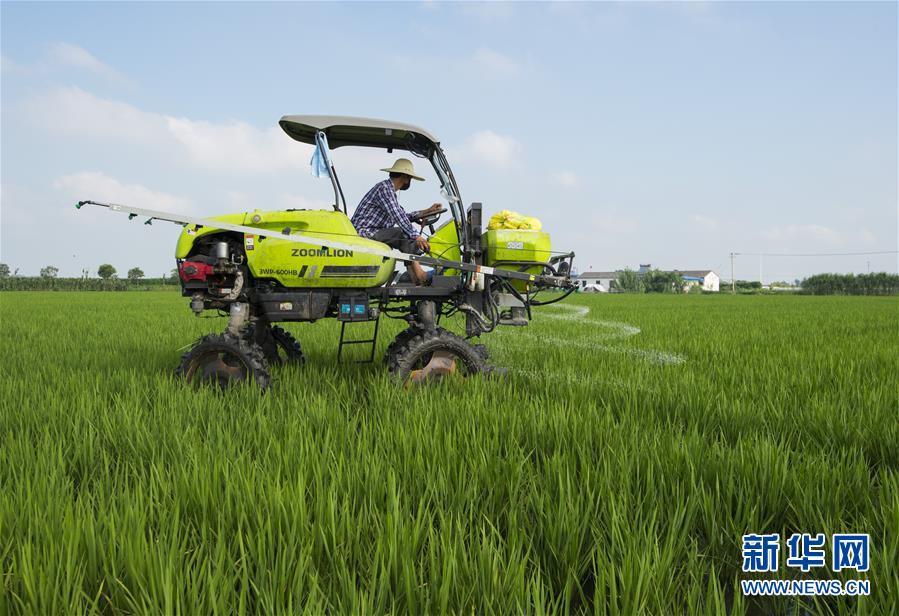 8月2日,在江苏南通海安市白甸镇周垛村林晓家庭农场,工作人员驾驶自走式植保机在水稻田作业。 新华社发(徐劲柏 摄)