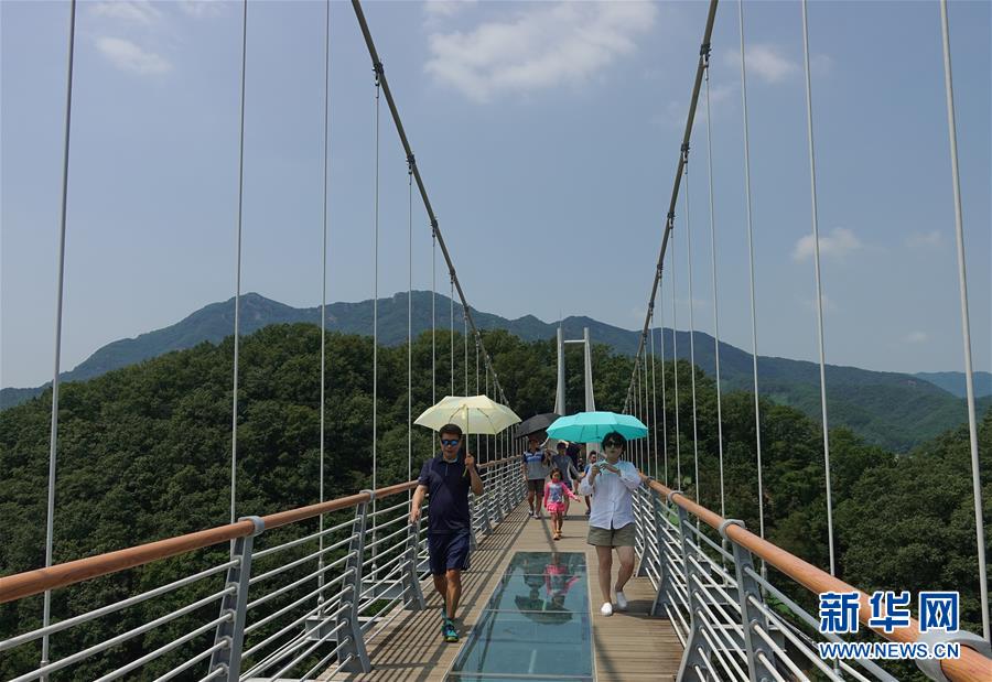 8月2日,游客撑伞游览位于韩国京畿道抱川市的“天空之桥”。 近日韩国持续高温天气,多地刷新高温纪录。 新华社记者王婧嫱摄