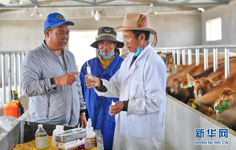 在噶尔县生态农业产业园奶牛场,场长贡桑其美(左)和兽医及饲养员商量牛群防疫事宜(8月1日摄)。 新华社记者张汝锋摄