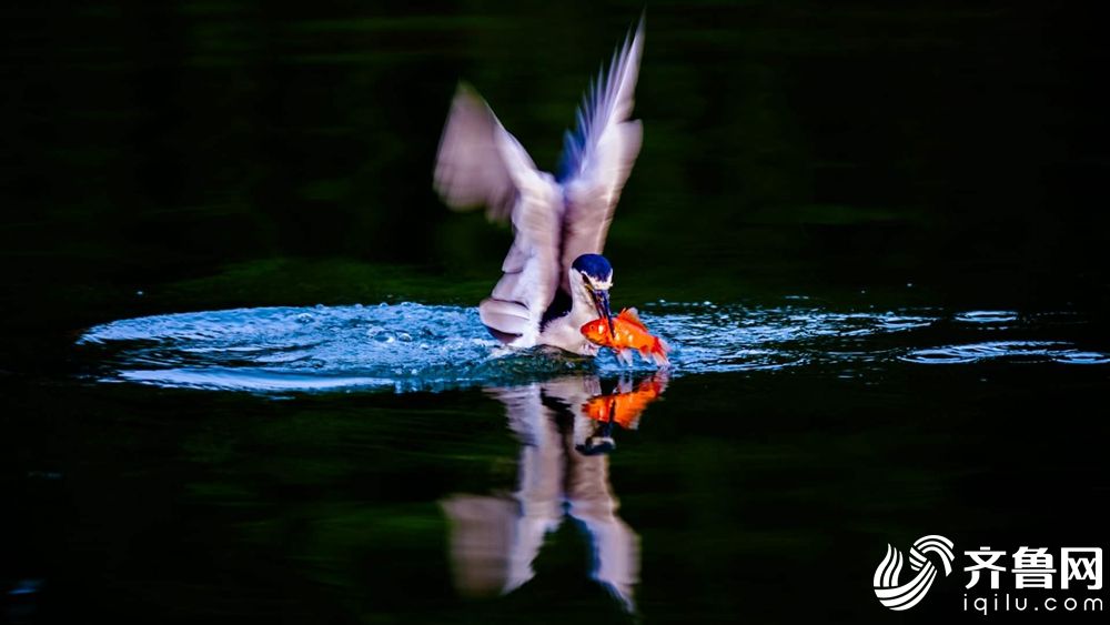 大明湖夜鹭在水面捕食。(齐鲁网发 宋广兴摄)