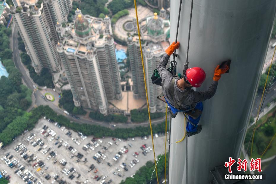 8月3日,高空清洁工使用湿布擦洗广州塔108层外的钢柱。据悉,广州塔定期会对外墙玻璃、钢结构进行清洁,每次清洁耗时一个多月。目前,广州塔聘请了清洁公司为385—450米的东面区钢结构进行清洁工作。中新社记者 陈骥旻 摄