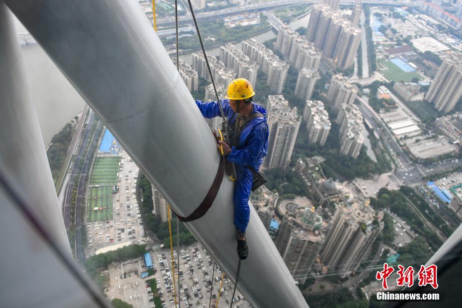 8月3日,高空清洁工使用湿布擦洗广州塔108层外的钢柱。据悉,广州塔定期会对外墙玻璃、钢结构进行清洁,每次清洁耗时一个多月。目前,广州塔聘请了清洁公司为385—450米的东面区钢结构进行清洁工作。中新社记者 陈骥旻 摄