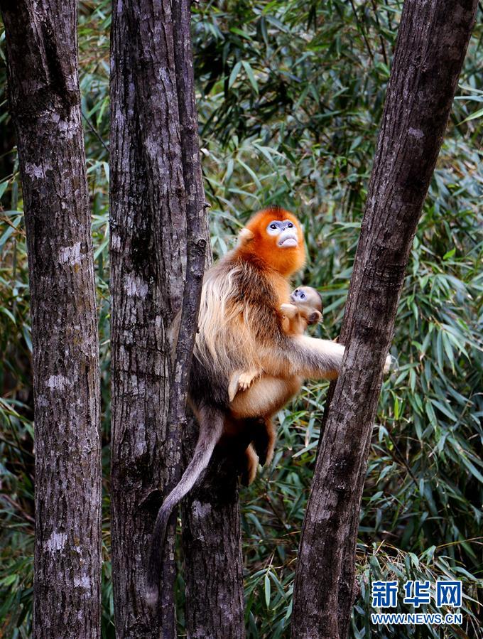 秦岭金丝猴在陕西佛坪县熊猫谷内休憩(8月3日)。 新华社记者 刘潇 摄