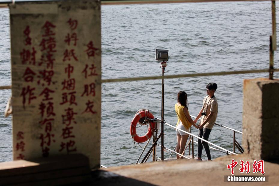 香港的西环钟声泳棚位于港岛西区域多利道及摩星岭地段,再沿几段狭窄楼梯就可抵达。泳棚建于 60、70年代,由于当时公众泳池还未普及,于是便出现不少在海边搭建的泳棚,方便泳客们更衣、贮物。近年来,西环泳棚除了游早泳的市民外,已成为户外远足者和摄影迷到访的热门地方。这里陈旧的木桥、灯塔,曲径通幽的阶梯以至黄昏日落美景等景观,吸引很多情侣来游玩及拍婚纱照。图为8月4日,一对情侣在西环泳棚留影。 中新社记者 洪少葵 摄