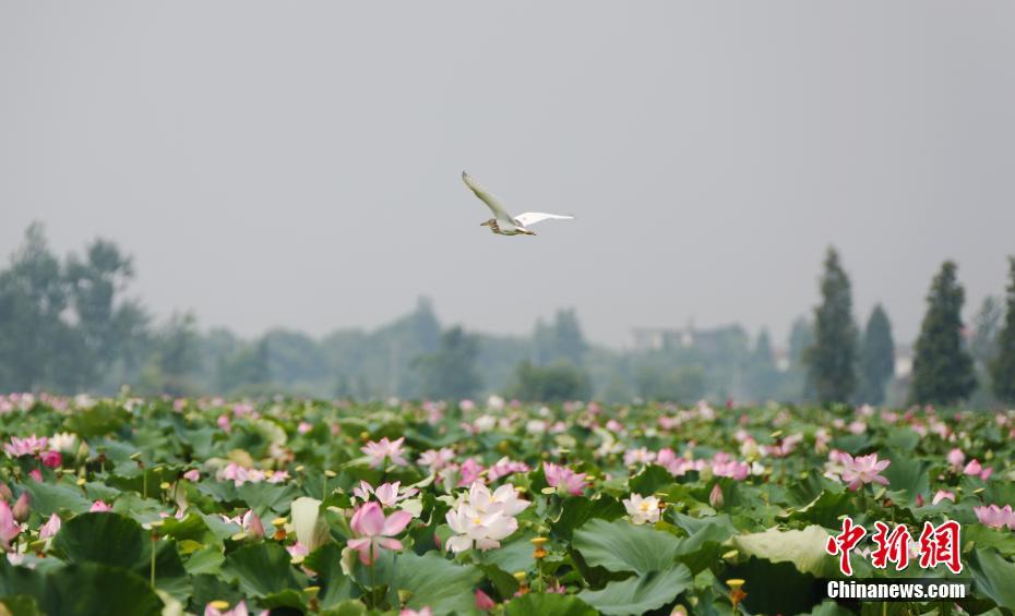 一只白鹭飞越连绵不绝的荷塘之上。 刘占昆 摄