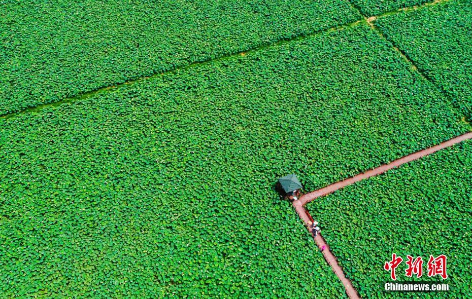 航拍江西南昌新建区联圩生态白莲产业园基地,放眼望去,千亩莲田延绵不绝,美丽的荷花竞相开放。甘来 摄