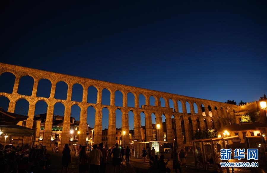 这是8月5日在西班牙塞哥维亚拍摄的古罗马输水道夜景。建于公元1世纪的古罗马输水道是西班牙小城塞哥维亚的象征,也是世界文化遗产。新华社记者 郭求达 摄