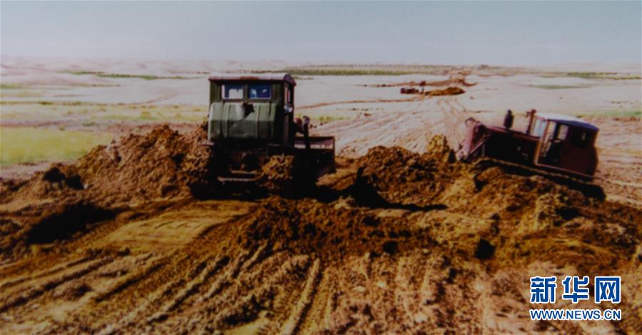 这是内蒙古鄂尔多斯市杭锦旗库布其沙漠生态科技中心展览馆保存的20世纪90年代杭锦旗人民修建“锡乌”穿沙公路的照片(翻拍照片)。